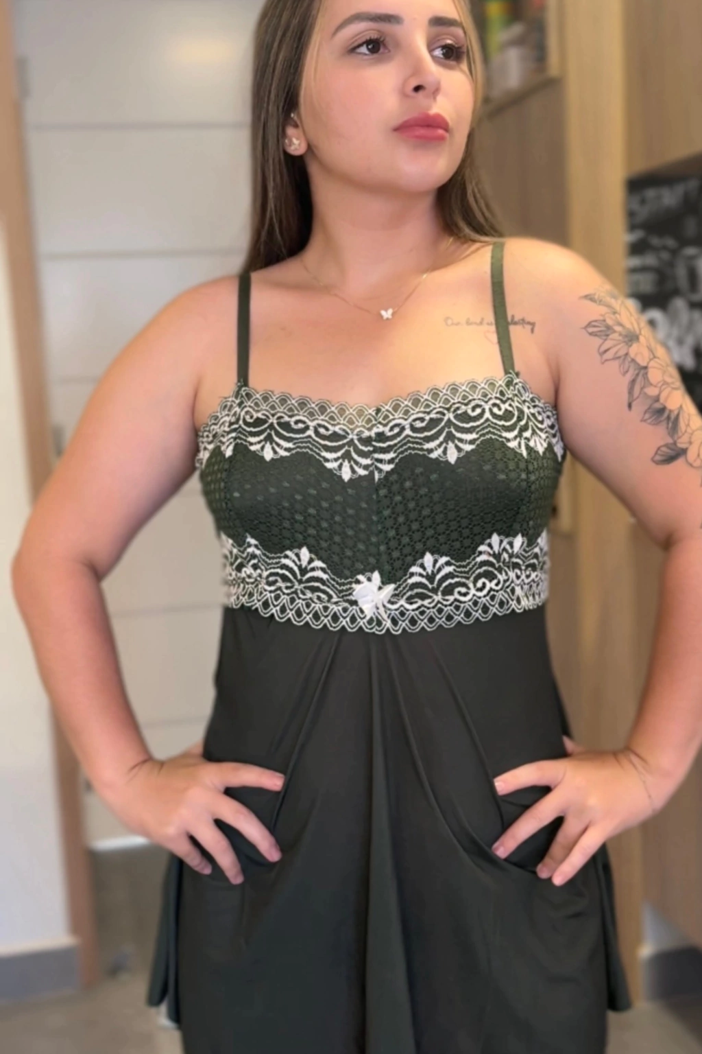 A camisola surge em um tom de verde profundo e sofisticado, transmitindo calma e aconchego ao primeiro olhar. O busto é adornado por uma renda off-white delicadamente trabalhada, que cria um contraste suave e elegante com o tecido verde. A faixa rendada abaixo do busto destaca a feminilidade da peça, enquanto o caimento leve em liganete proporciona movimento e conforto. Cada detalhe foi pensado para valorizar a beleza natural e trazer uma sensação de leveza e delicadeza ao vestir.
