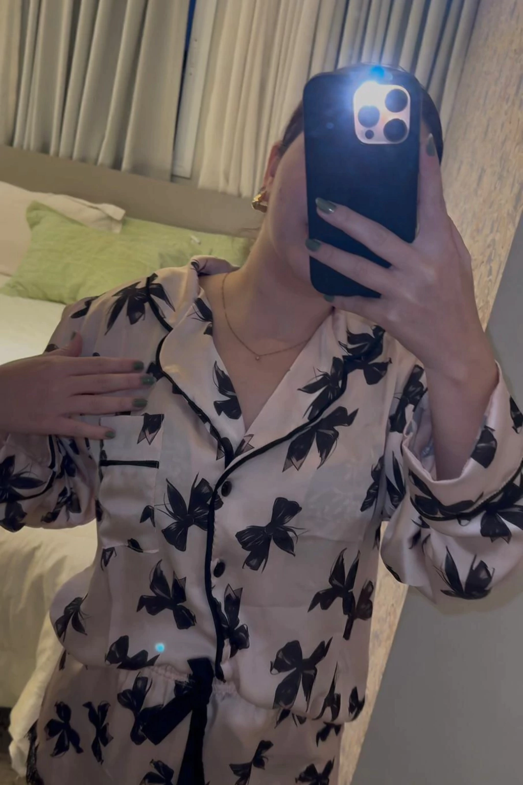 Esse pijama estilo americano é confeccionado em cetim de seda sintética, um tecido conhecido por sua textura macia e brilho acetinado que eleva o nível de conforto e elegância. A blusa de manga longa conta com botões frontais e acabamento com vivos contrastantes, criando um visual clássico e refinado. com estampa de laços, toque acetinado e acabamento em renda preta